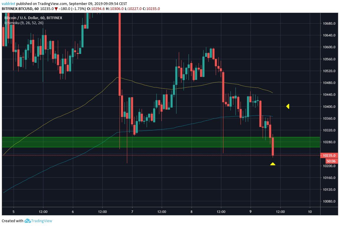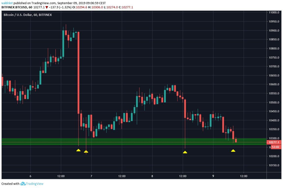 On August 30, 2019, the Bitcoin price reached a low of $9387. An uptrend began, that lasted until September 6, culminating with a high of $10,900. The price has been decreasing since. At the time of writing, it was trading close to $10,300.