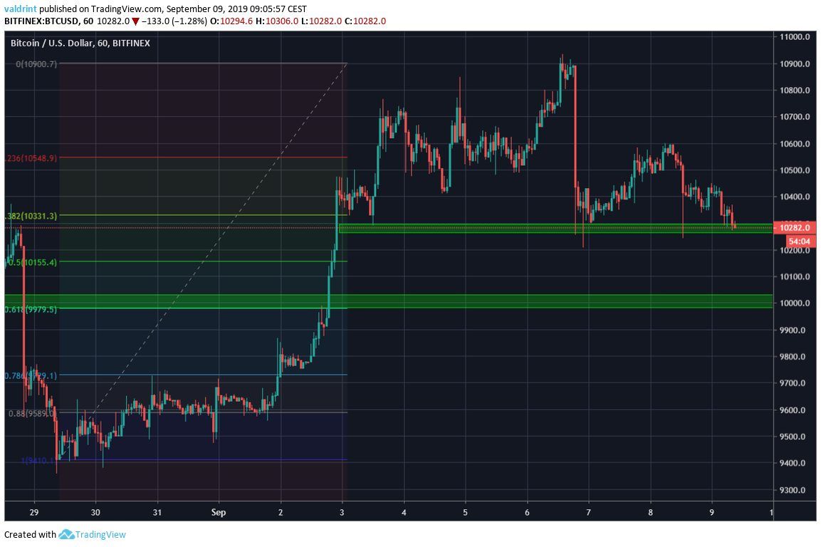 The $10,000 support area also coincides with the 0.618 fib level, making it a very suitable level for the initiation of a reversal.
