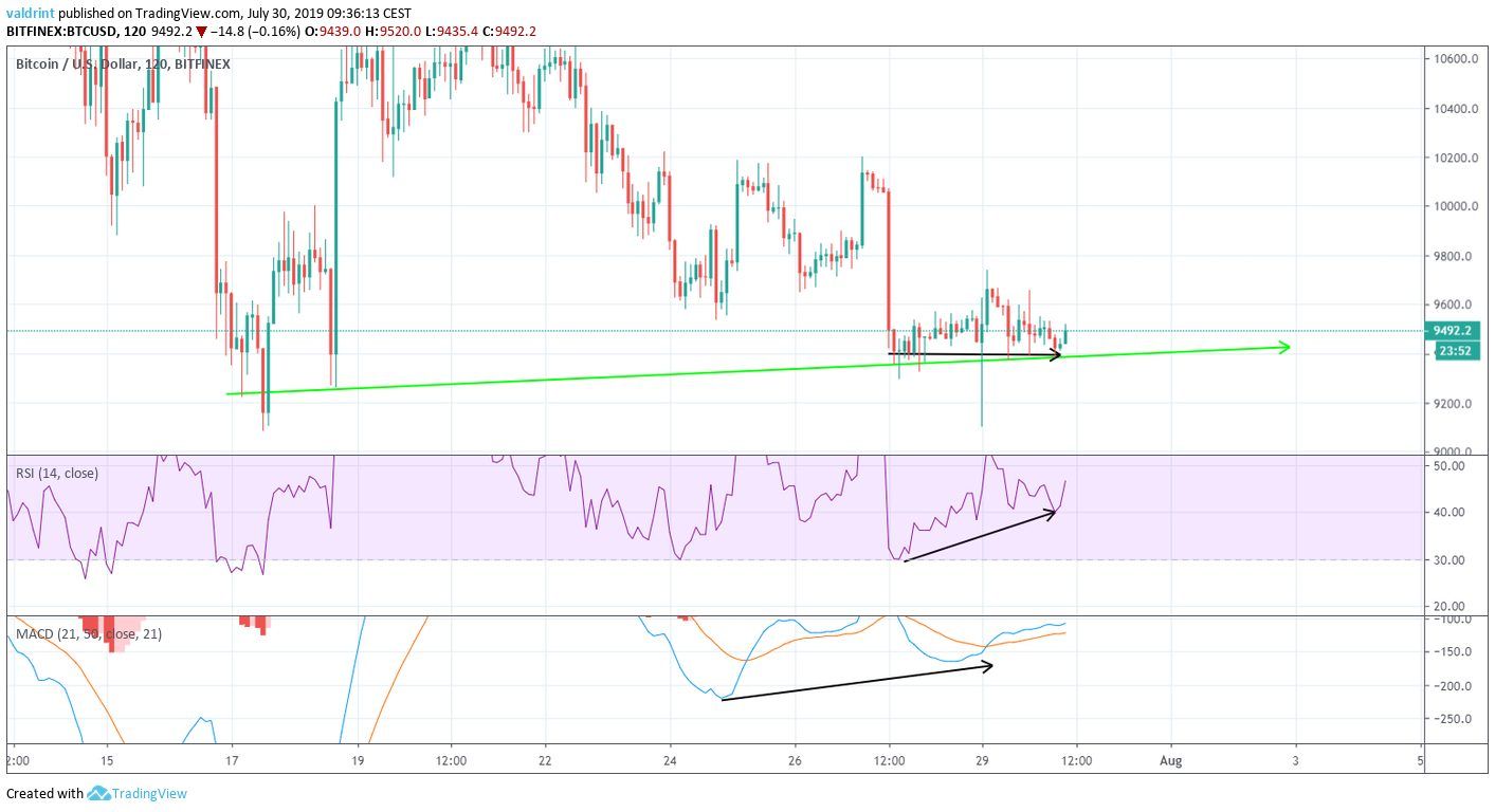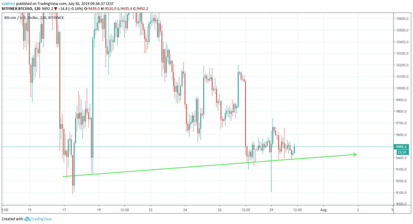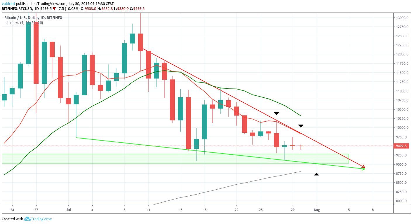 On July 17, 2019, the Bitcoin (BTC) price reached a low of $9084. An upward move ensued. On July 21, it reached a high of $11,098. Since then, it has been slowly decreasing. The decrease culminated with a low of $9101 reached on July 29.