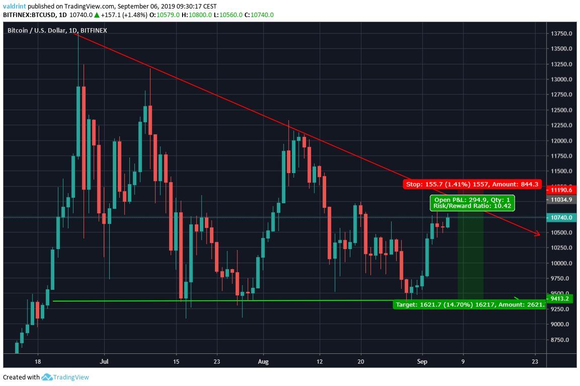 Placing a stop loss above the descending resistance line of the triangle at $11,200 and a target of $9400 gives us an R:R ratio of more than 10.
