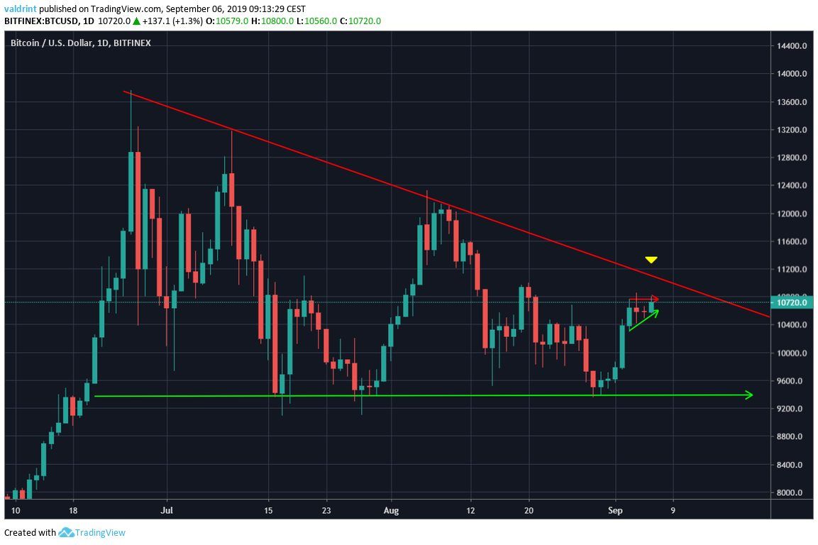 We can see that the Bitcoin price has been trading inside a descending triangle since the end of June.