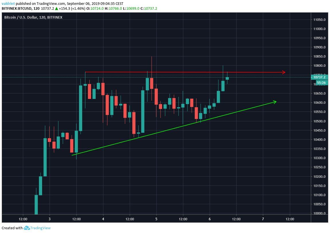 The price movement since September 2 shows a developing triple top in the price of Bitcoin, with three near-identical highs of $10,750.