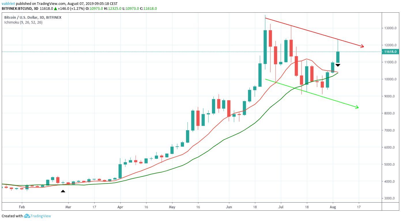 On July 30, 2019, the Bitcoin price reached a low of $9380. A gradual upward move ensued. On August 6, BTC briefly reached a high of $12,325. A rapid decrease followed. The next day, BTC reached a low of $11,249.