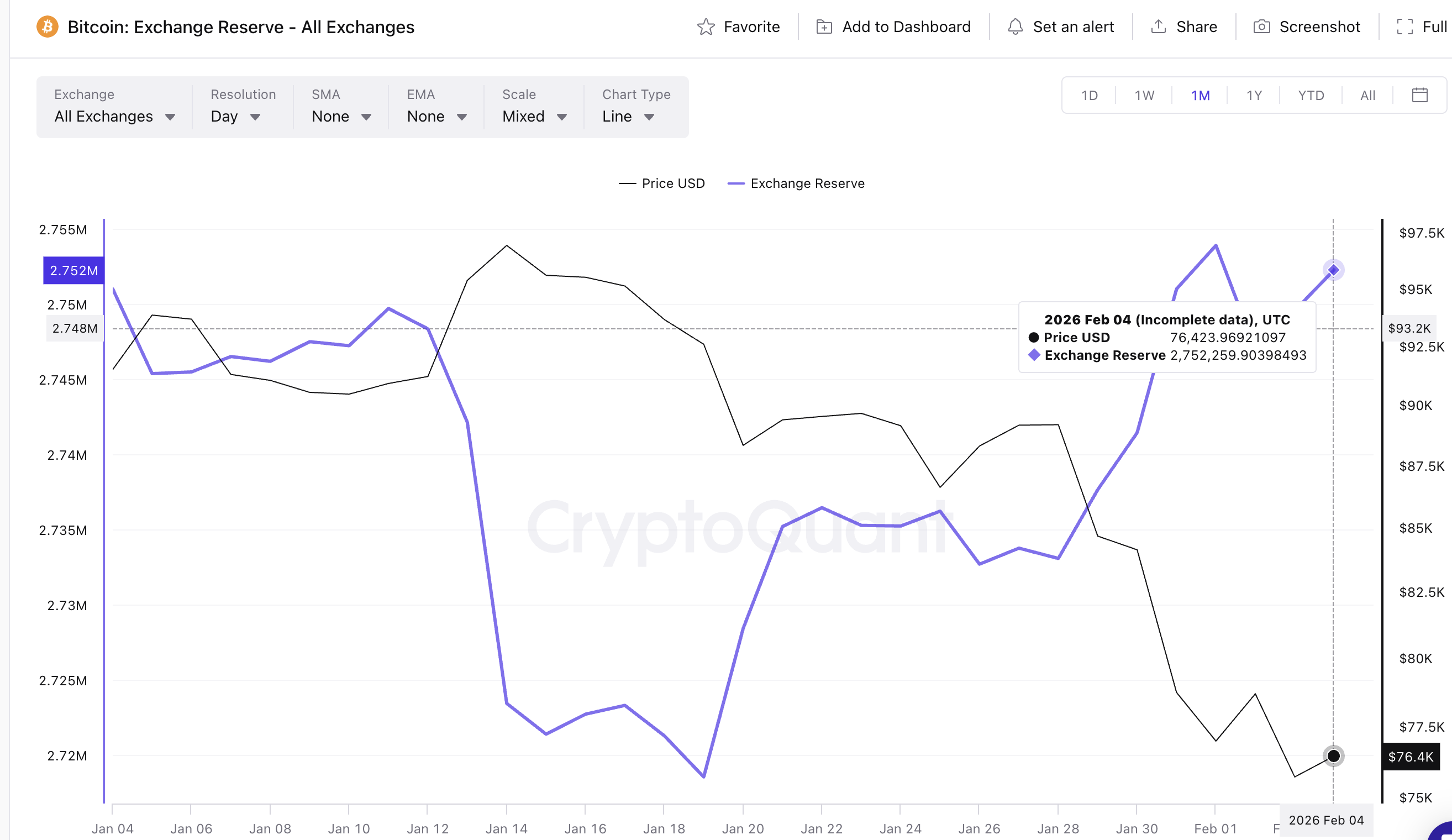Bitcoin exchange reserves hit a recent low of 2.718 million BTC on January 19. Since then, reserves have climbed to about 2.752 million BTC.