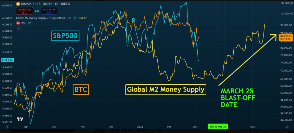 With global liquidity expanding, analysts predict that Bitcoin and other digital assets could experience a significant rally, starting around March 25, 2025, and potentially lasting until mid-May.