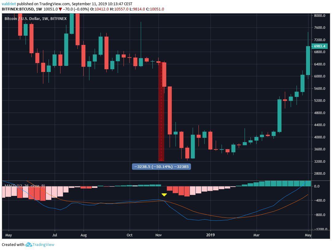 When the bearish cross occurred, Bitcoin was trading at $12,000.