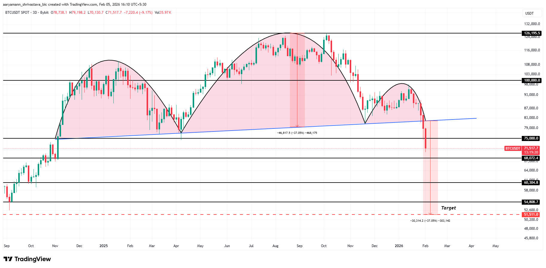 This structural weakness aligns with a macro bearish setup visible on the charts. Bitcoin is breaking down from a Head and Shoulders pattern that has been developing for months. This formation carries a projected downside of roughly 37%, targeting $51,511 if fully realized.