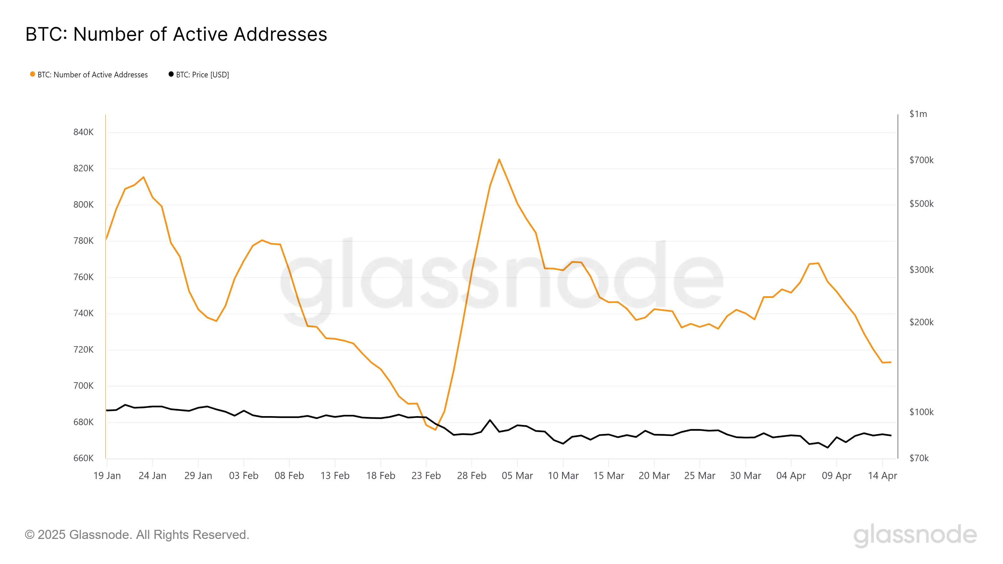 The overall macro momentum of Bitcoin also points to hesitation among market participants. Active addresses on the Bitcoin network are at a nearly two-month low, suggesting reduced engagement.