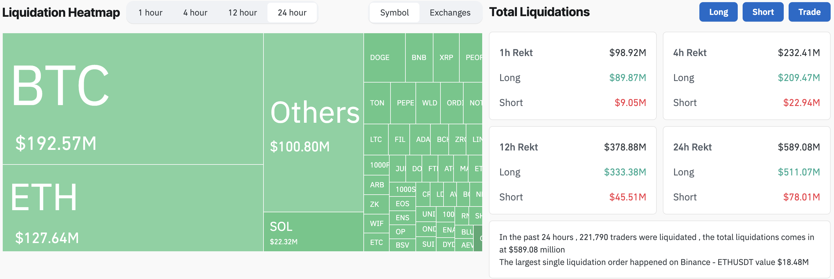 The volatility in Bitcoin and the broader crypto market has caused huge liquidations. In total, $589 million was liquidated, which included more than $511 million in long positions and $78 million in shorts. Notably, nearly $100 million was liquidated in just the past hour.