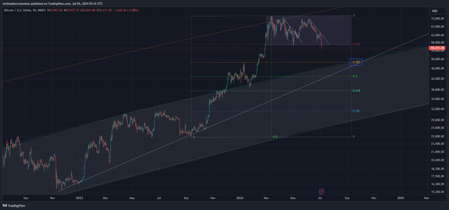 Concurrently, crypto analyst Dave the Wave noted that Bitcoin had breached a critical support level at $56,500. He pointed out that the next significant Fibonacci level, around $48,000, could provide the necessary support.