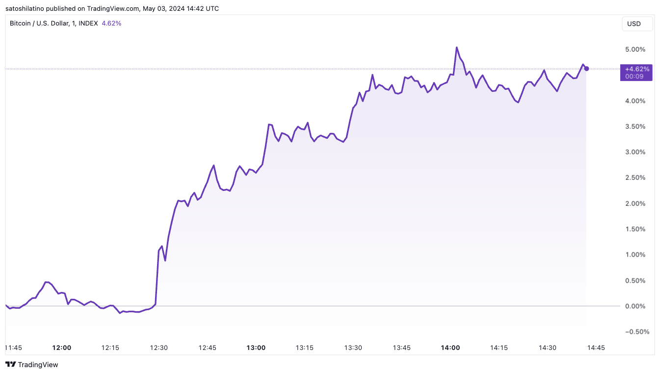 Despite these mixed signals, the market’s response was unexpectedly positive. Bitcoin swiftly ascended above the critical $60,000 threshold to reach an intraday high of $62,150 at the time of writing.