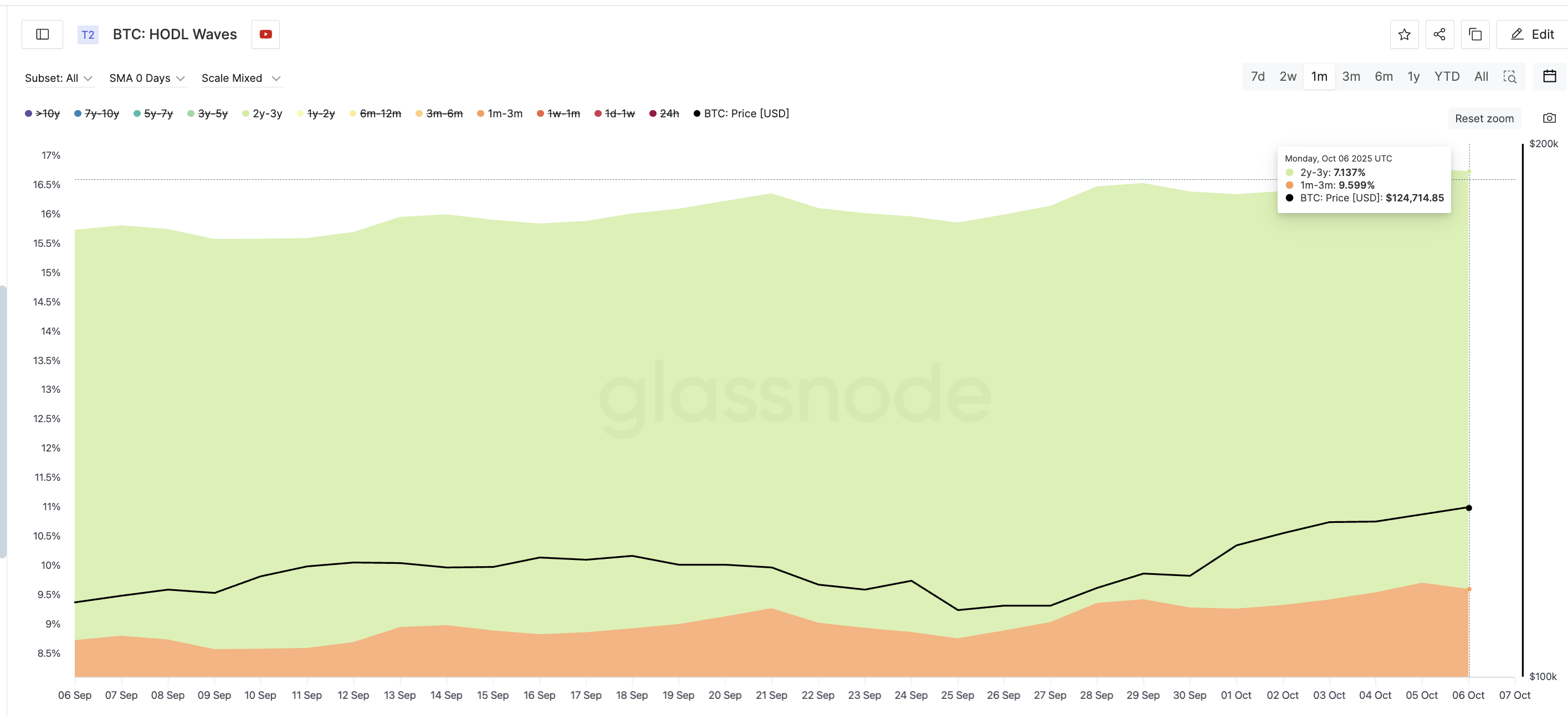 To confirm this, we look at HODL Waves, which show how long coins have stayed unmoved. Over the past month, both short-term and long-term holders have added to their holdings. The 1–3 month cohort grew from 8.75% to 9.59% of supply, while 2–3 year holders ticked up from 7.00% to 7.13%.