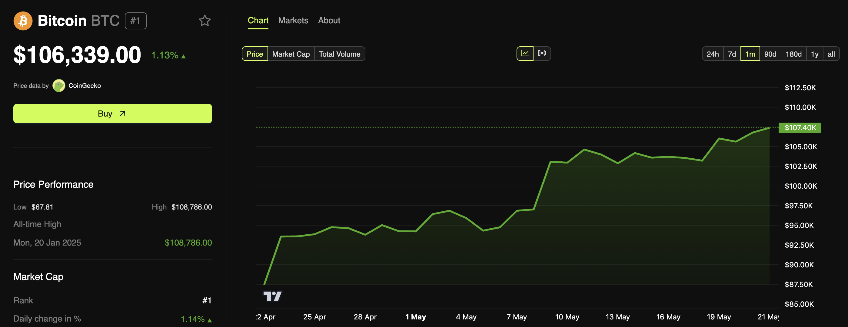 Bitcoin’s price performance is equally encouraging. Over the past month, the price has appreciated by 21.5%. At press time, BTC was trading at $106,339, just 2.3% below its record high.