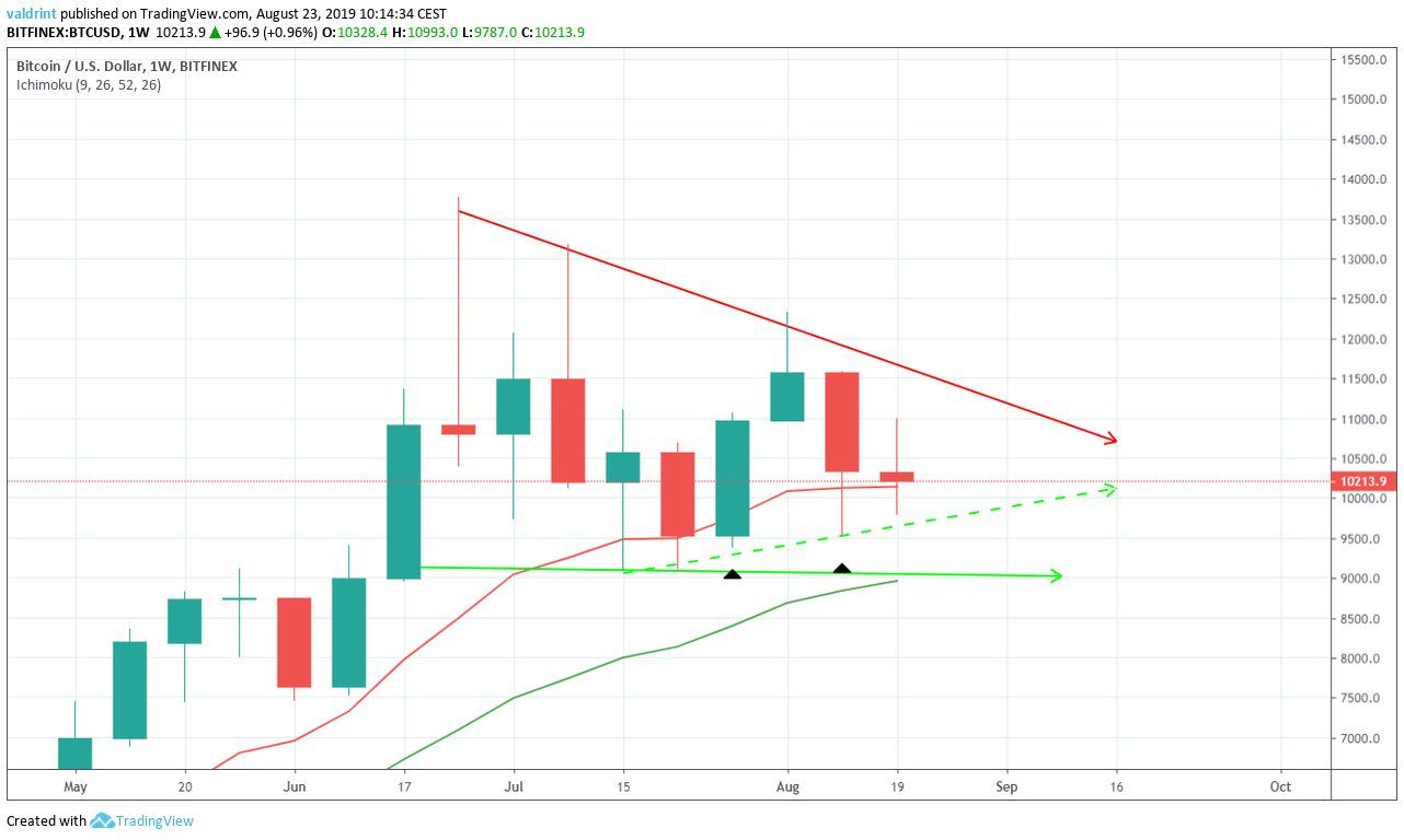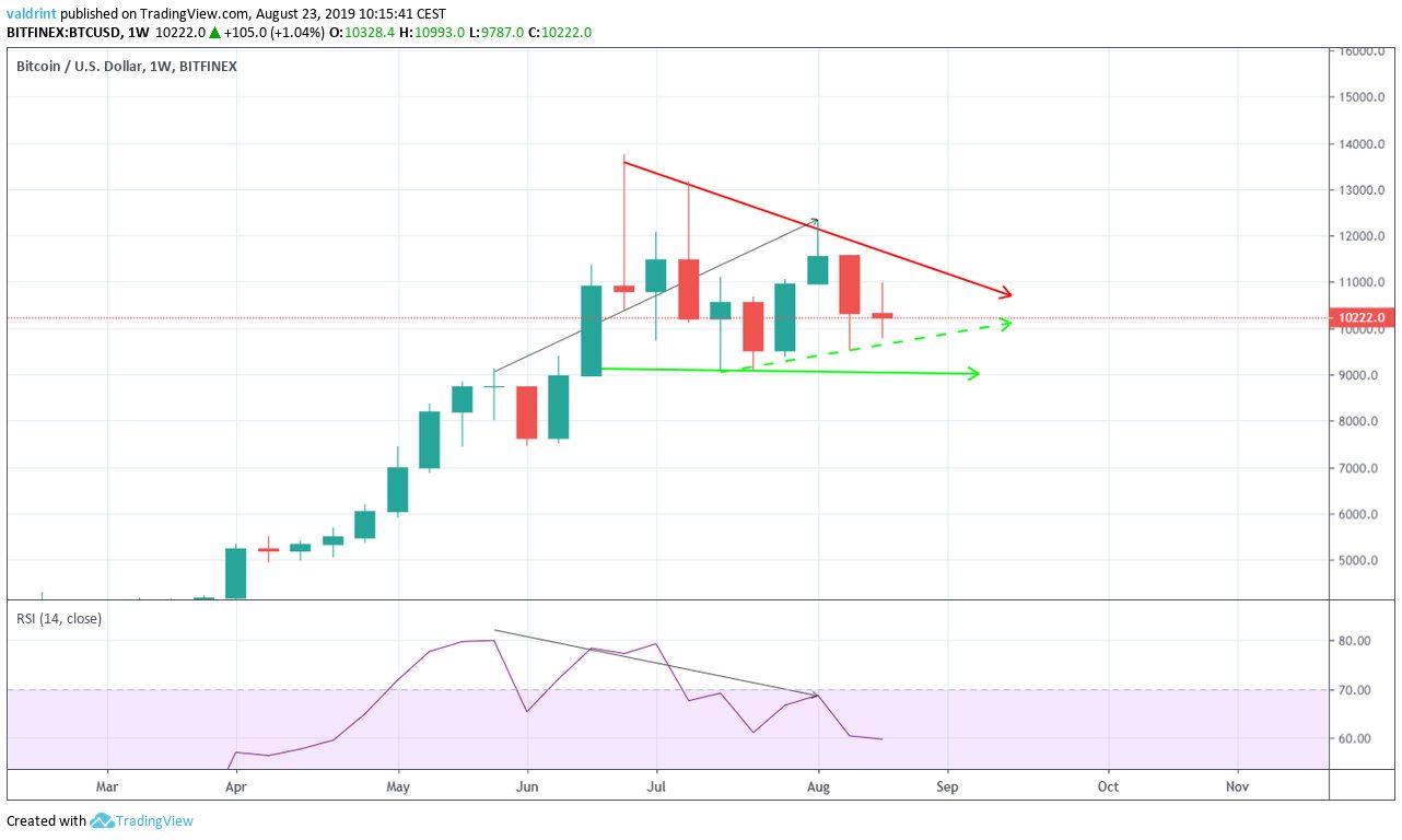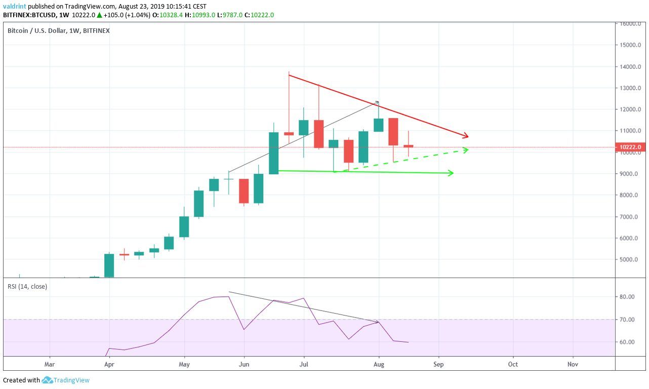 A weekly close below $10,000 could be the catalyst for a rapid price decrease.