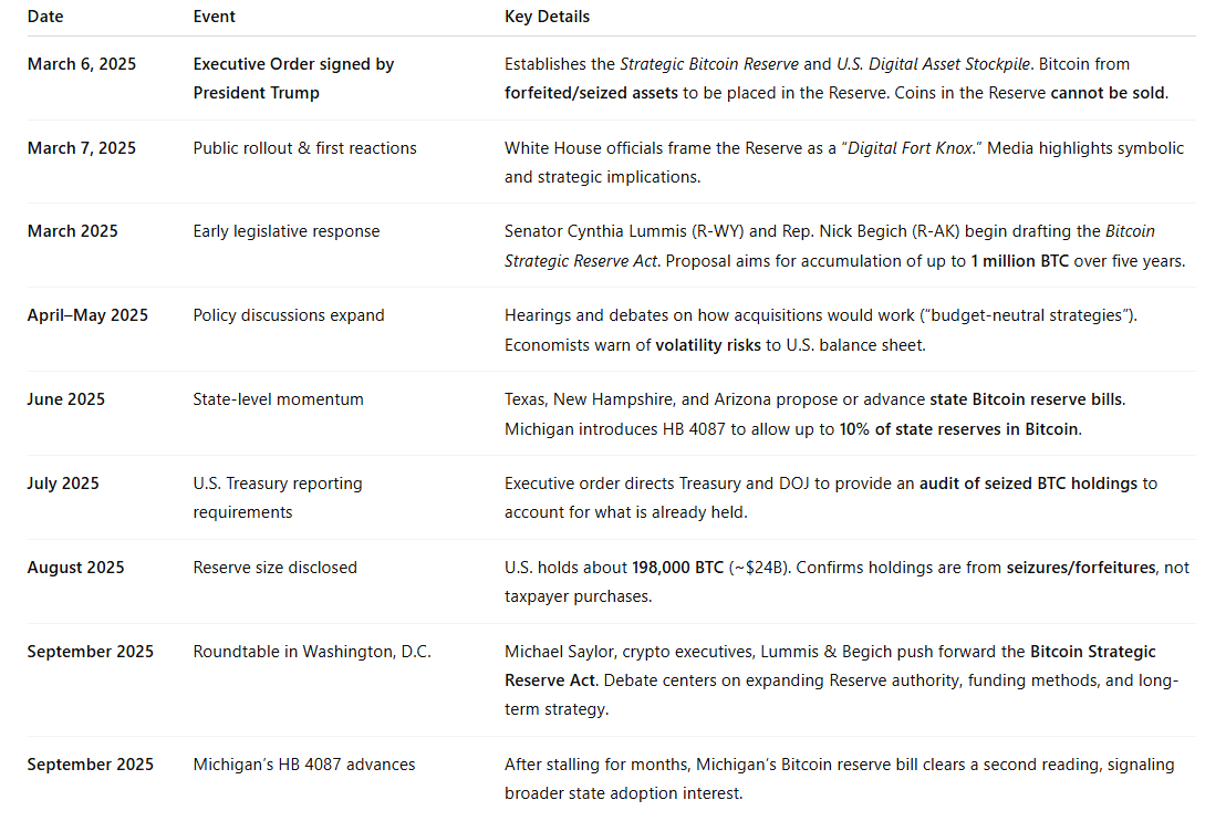 - Pending bills: Senator Cynthia Lummis and Rep. Nick Begich introduced the Bitcoin Strategic Reserve Act, which in some drafts proposes accumulating up to 1 million BTC over five years.