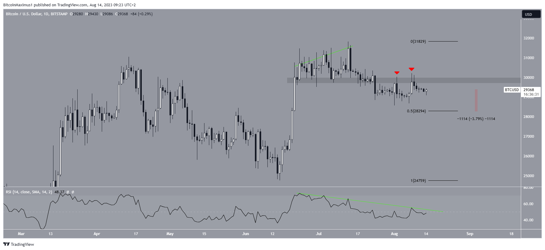 Secondly, the price trades below the $29,800 minor resistance area, which has caused two rejections so far (red icons). The area is also very close to the long-term $30,500 resistance.