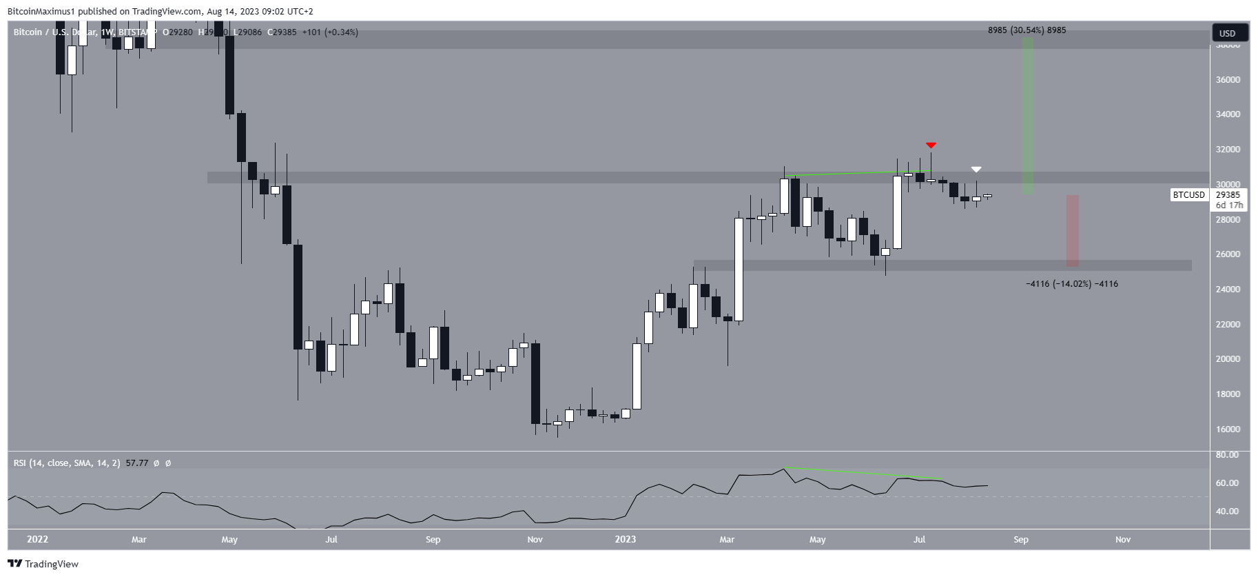 The weekly timeframe technical analysis for BTC provides a bearish outlook. The main reason for this is the rejection of the $30,500 resistance area and the subsequent decrease (red icon). The rejection also created a long upper wick, considered a sign of selling pressure.