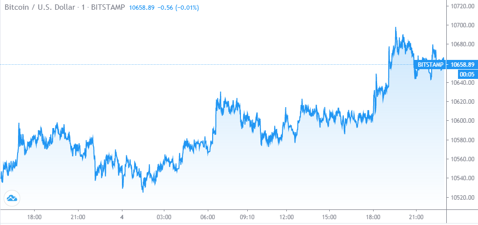 Bitcoin has moved up 0.9 percent over the past 24 hours, ranging between $10,565 and $10,663.