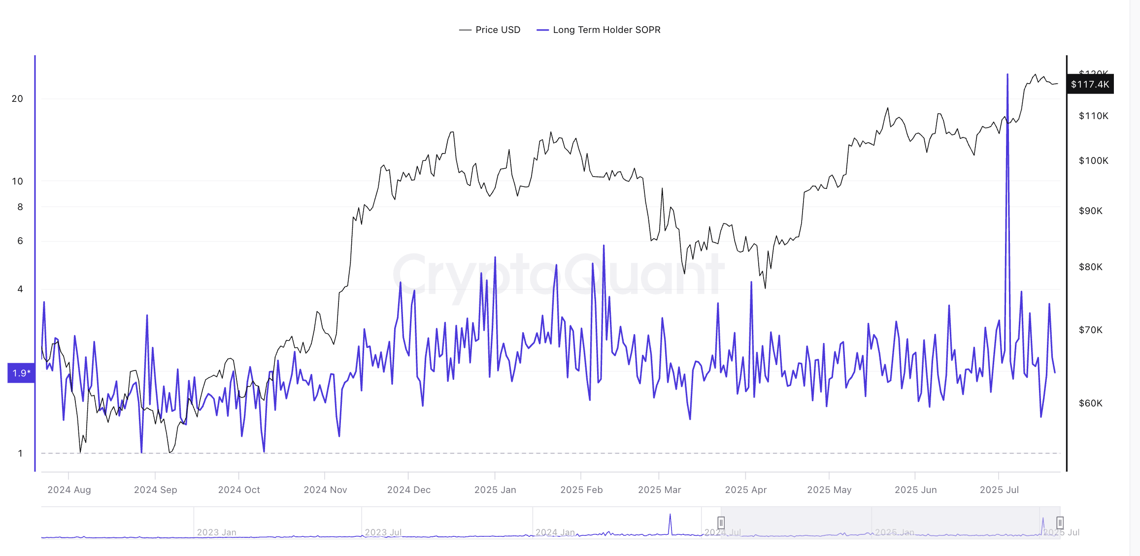 The Spent Output Profit Ratio (SOPR) for long-term holders, those holding BTC for more than 155 days, is showing consistent signs of profit-taking. As of July 21, the Long-Term SOPR stood at 1.96, meaning these holders are selling their coins for nearly double their acquisition cost.