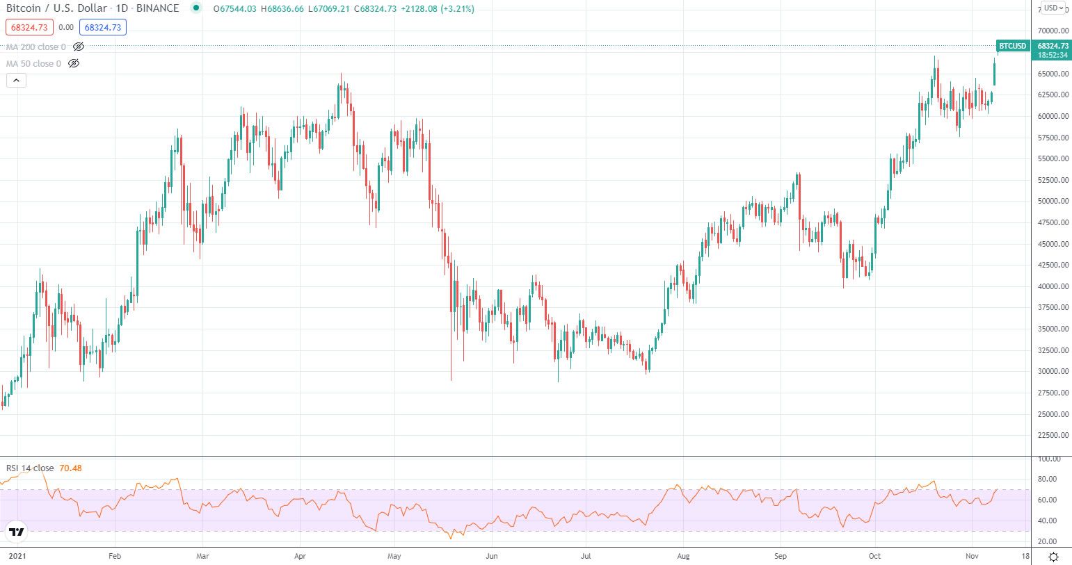 Bitcoin prices have reached their highest-ever levels during the morning trading session of Nov 9. This high is only around 2% off shy of reaching $70,000 per BTC.