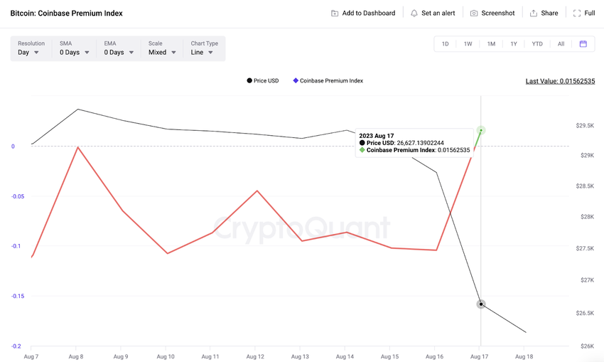 The chart above shows the Coinbase Premium Index has broken into positive values for the first time in August. This presumably means US investors have taken advantage of the dip to acquire more BTC.