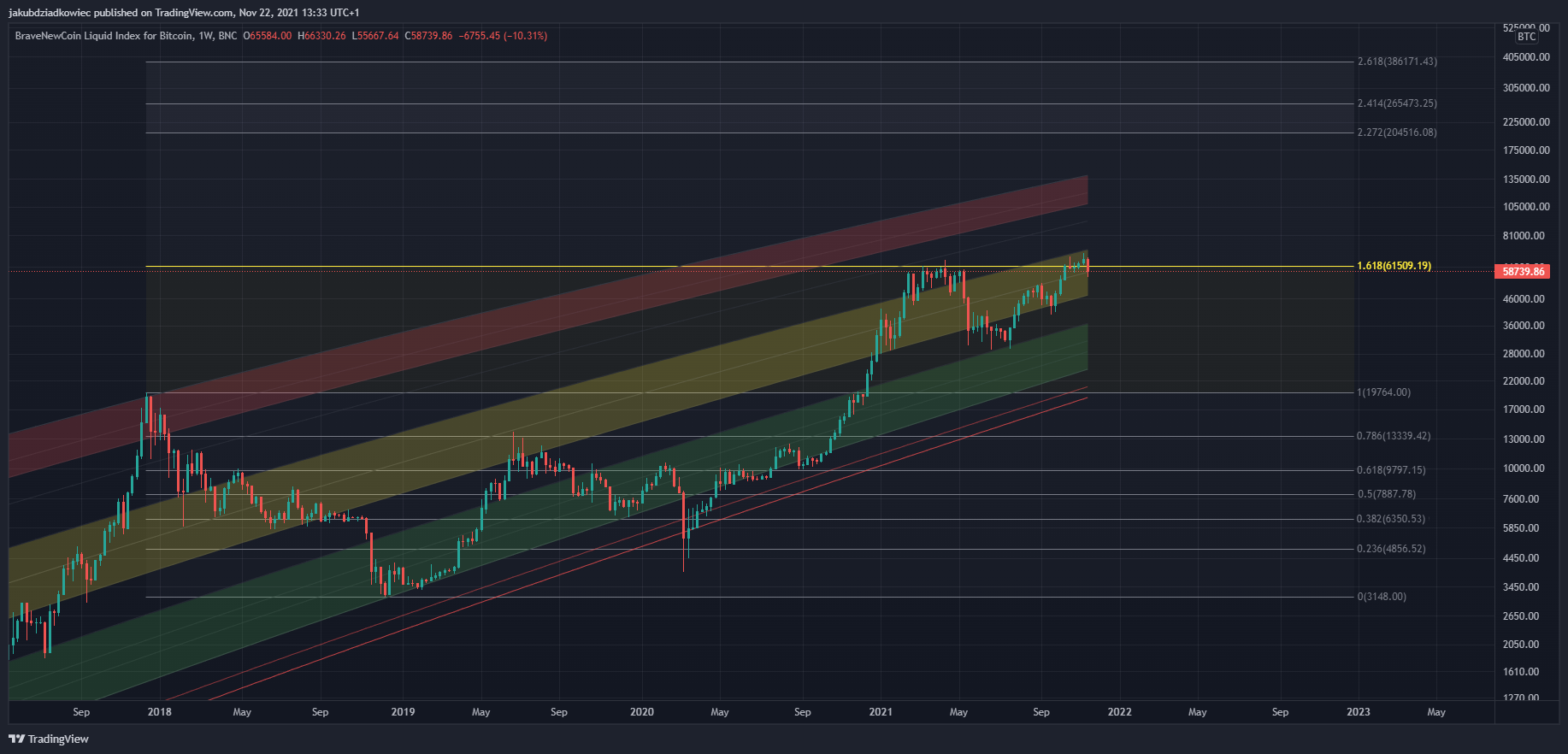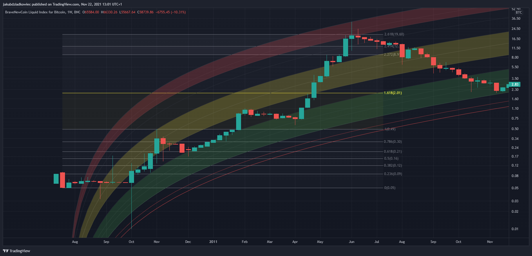 The rise of the previous cycle was much more stable than in previous cases. However, here too we see a certain period of consolidation in the yellow band area and the 1.618 Fib level at $3978. After its definitive breakout, the last phase of exponential growth took place.