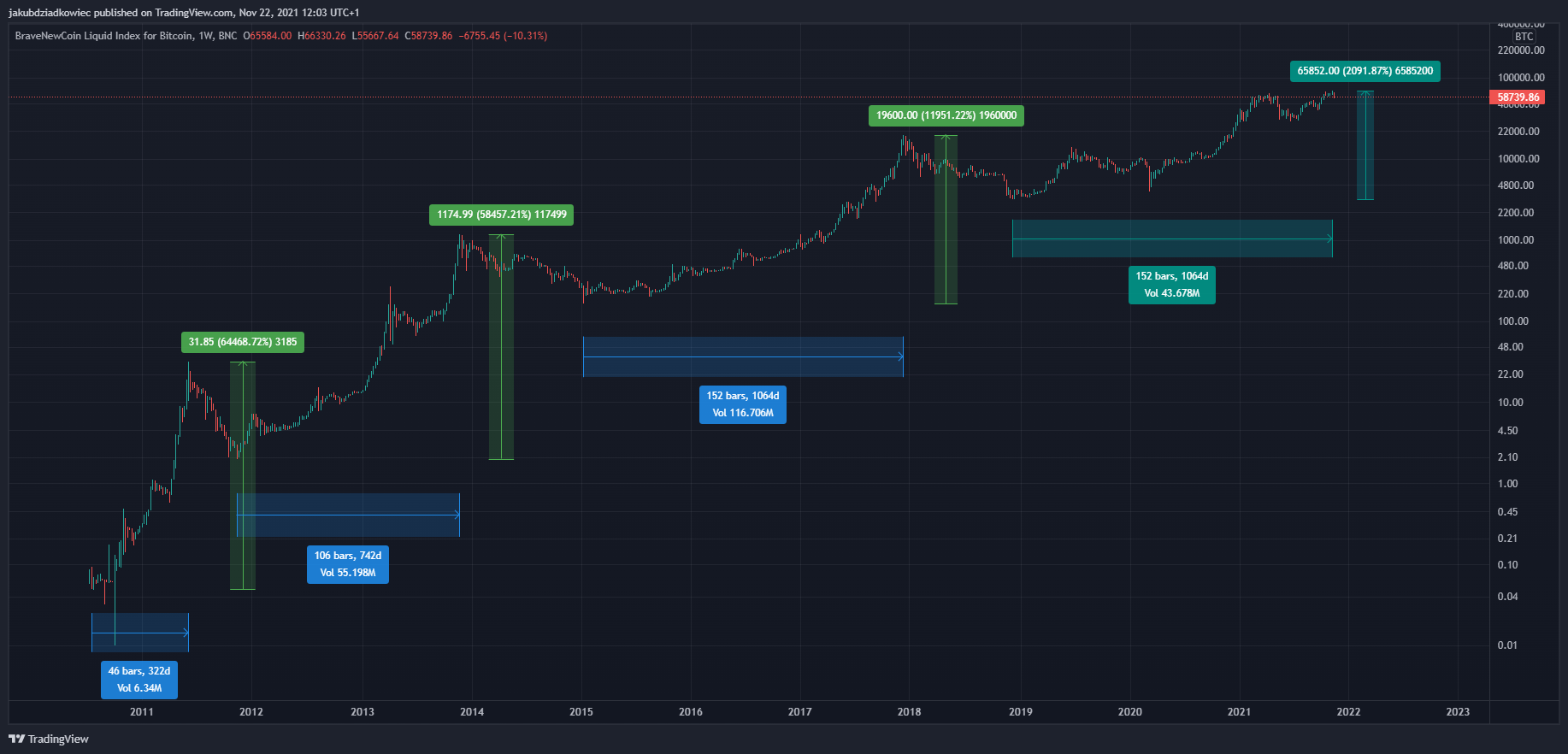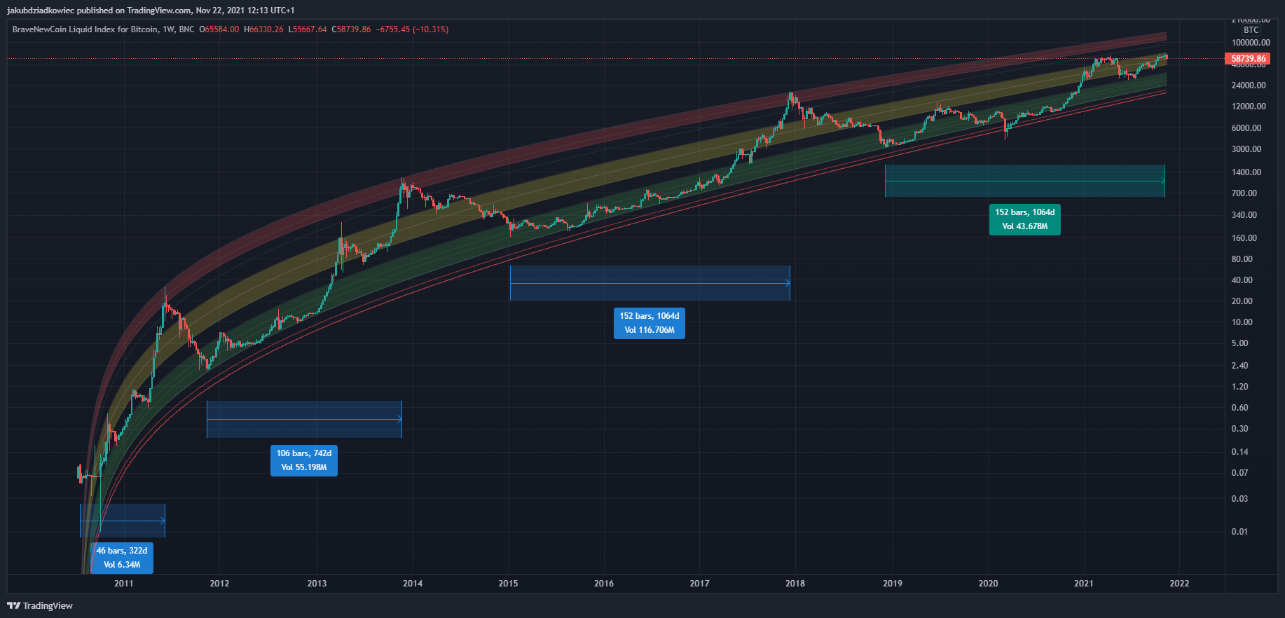 Bitcoin cycles can be measured in very many different ways: from halving to halving, peak to peak, bottom to bottom, etc. In this analysis, we only look at the structure of four bull markets, measuring from absolute low to absolute high. Bear market periods leading from peak to bottom will not be that relevant to us.