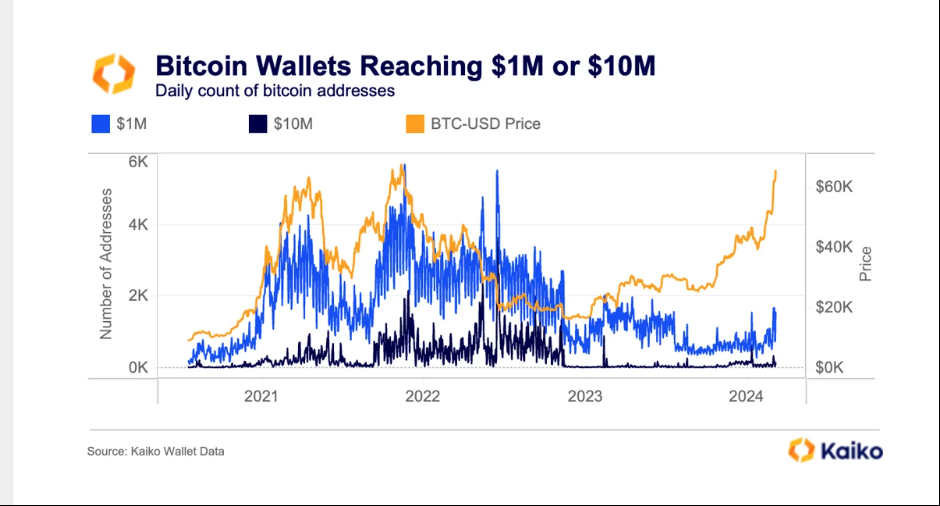 Bitcoin’s (BTC) current rally generates around 1,500 new “millionaire wallets” daily. This revelation comes from Kaiko Research, signaling a significant shift in wealth within the cryptocurrency ecosystem.