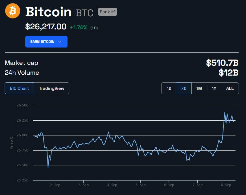 Bitcoin prices have had a little lift this Friday, gaining 1.7% on the day to reach $26,217 at the time of writing.