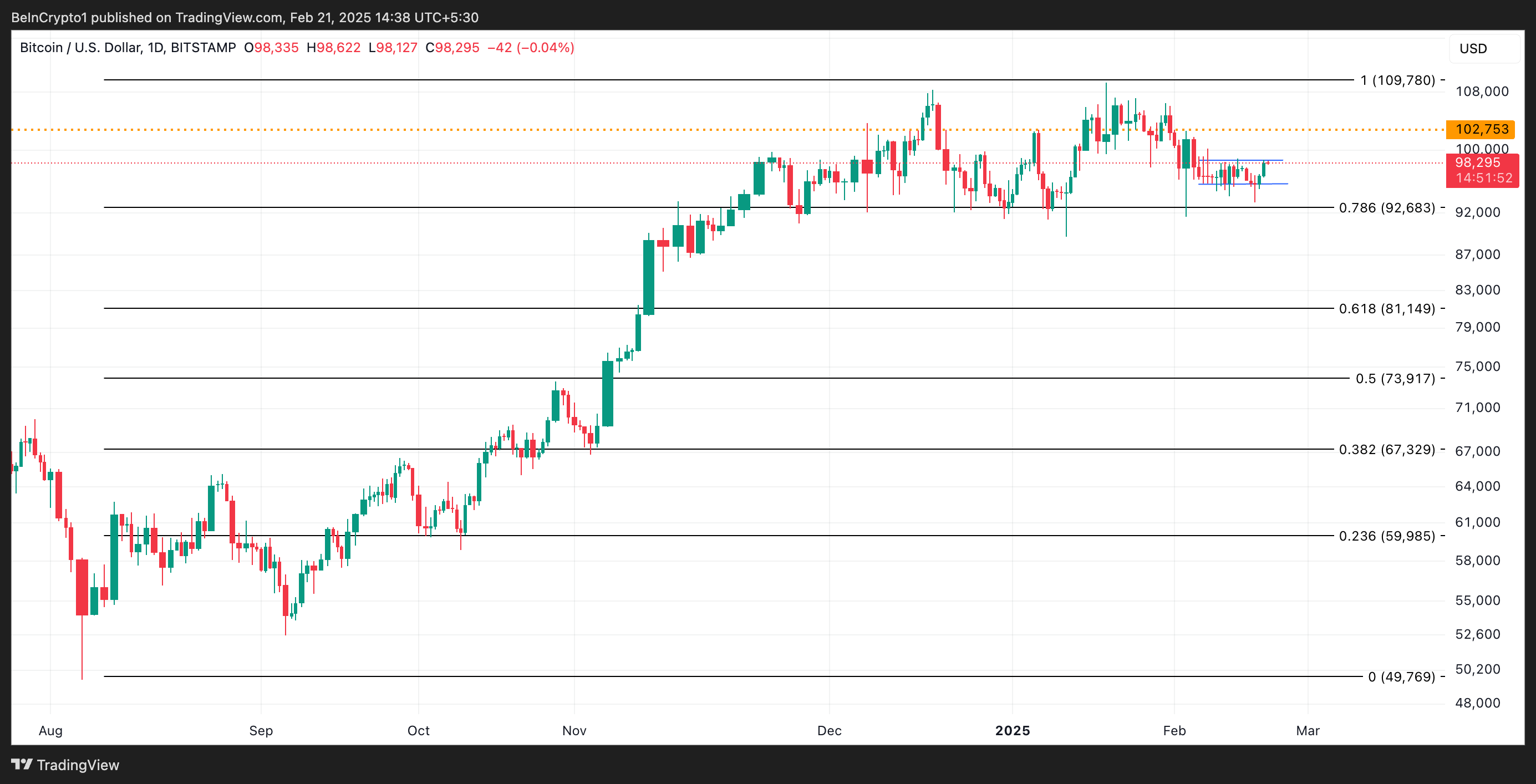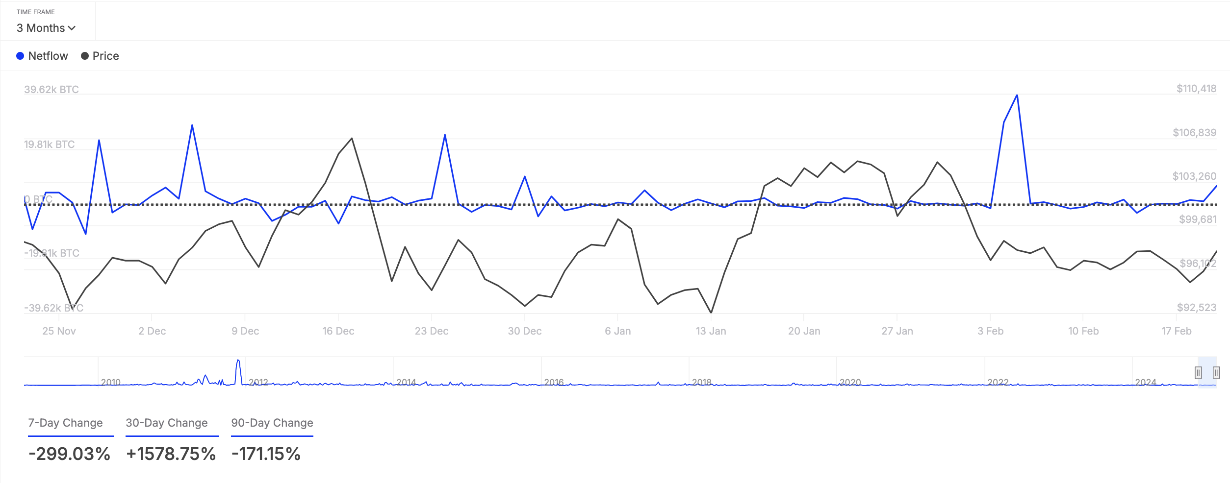 Notably, this trend coincides with BTC’s sideways price movement since the beginning of February. Over the past 15 days, the leading cryptocurrency has traded within a tight range, facing resistance at $98,663 while finding support at $95,650.