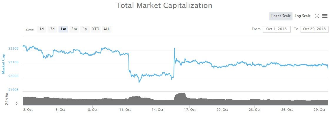 The total market cap of the cryptocurrency market has also remained fairly even, totaling between $220 billion and $196 billion so far in October.
