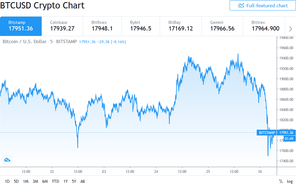 The Bitcoin price is currently hovering below $17,900 following a dramatic 11% slide that saw BTC lose over $1,000 in a little under three hours. Before the dip, BTC was attempting to surmount its ATH by possibly climbing above the $20,000 for the first time.