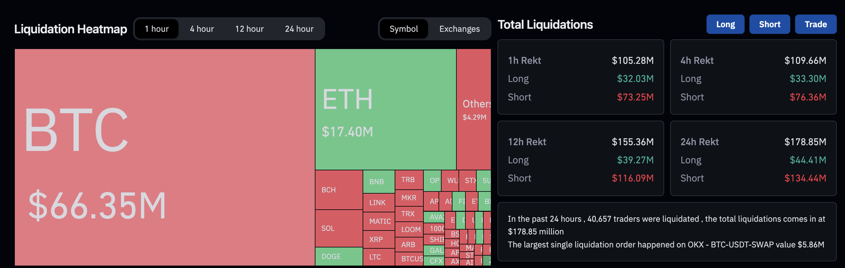 Due to the volatility brought by the rumors, trades worth over $105.28 million were liquidated in one hour. Specifically, $32.03 million in longs and $73.25 million worth of short trades were liquidated