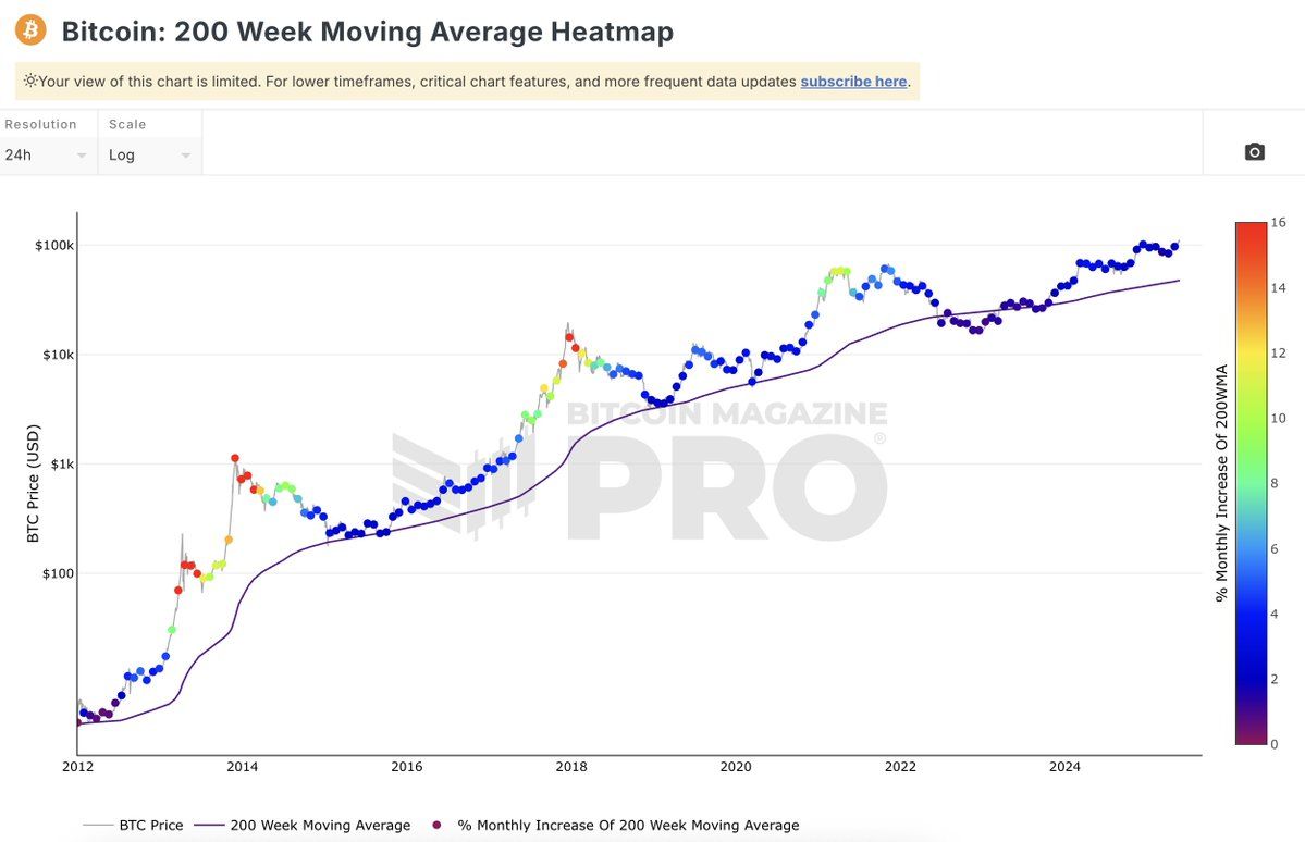 First, the $200,000 target is predicted using the 2023 version of the Rainbow Chart. This long-term valuation tool employs a logarithmic growth curve to forecast BTC’s potential future price direction. If this prediction is true, Bitcoin has only reached halfway through its journey in this cycle.