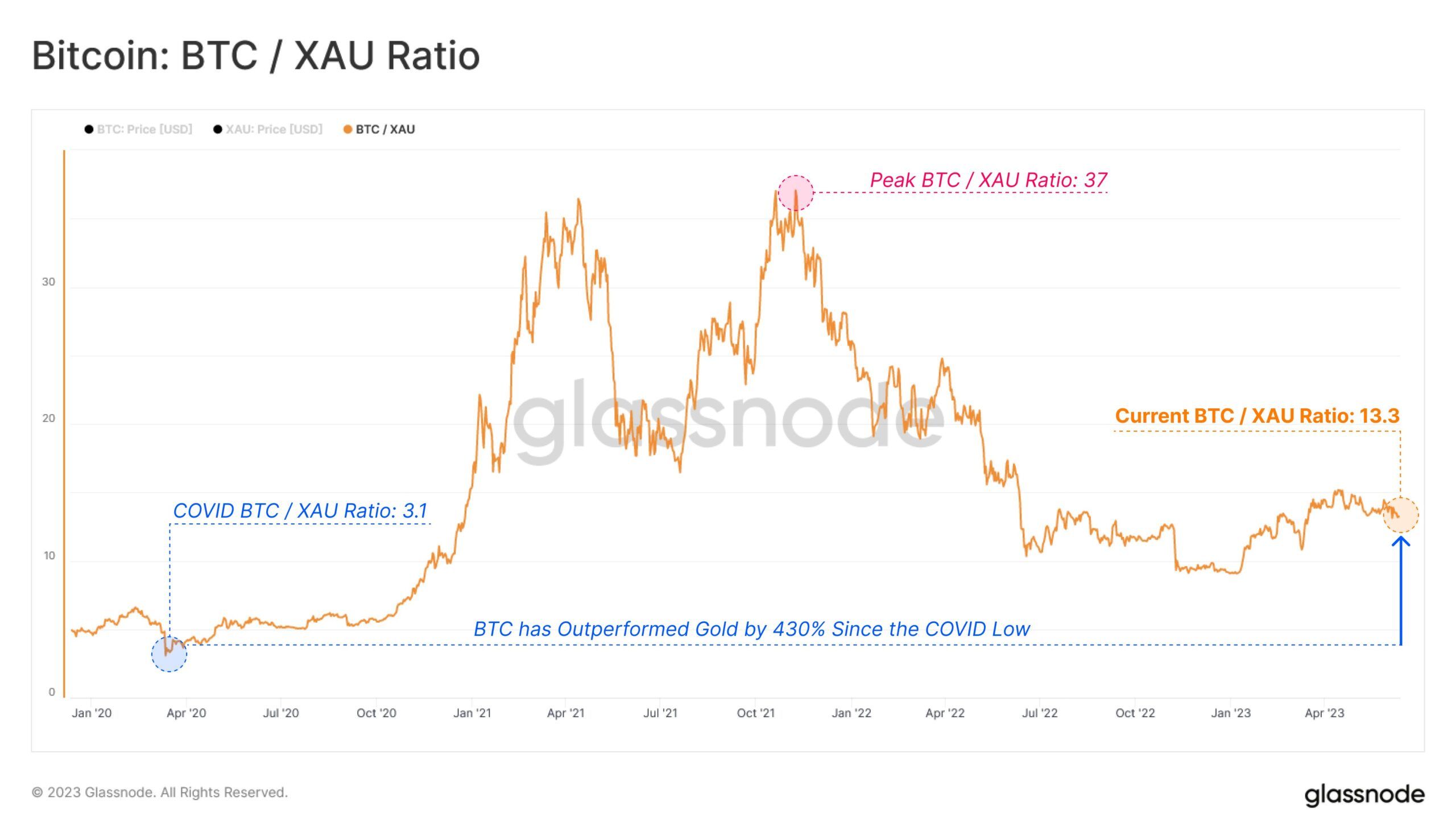 On-chain analytics firm Glassnode has been comparing Bitcoin prices with gold prices. Furthermore, the spot price of Bitcoin is equivalent to 13.3 ounces of gold, a year-to-date increase of 46%.