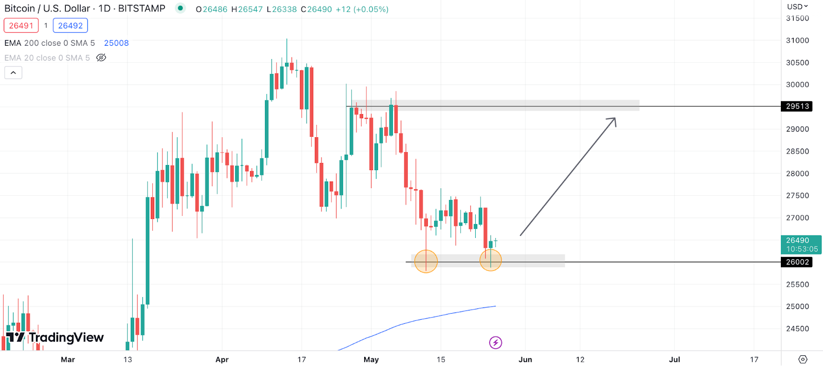 At the time of writing, the Bitcoin price has just tapped the strong support level at $26,000 – a level where price reversed aggressively on May 12.