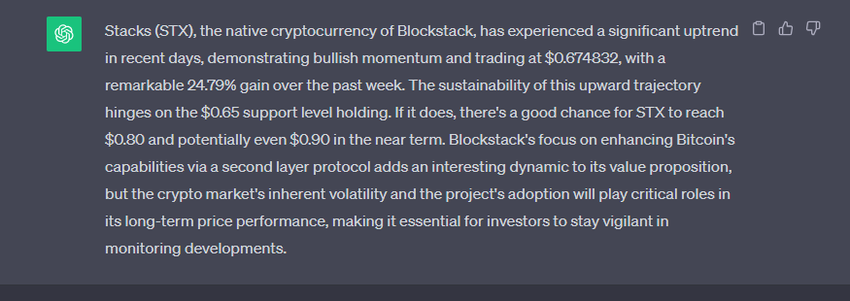 Meanwhile, ChatGPT predicts that there is a good chance for STX to reach $0.8 and potentially $0.9 in the near term. Currently trading above $0.6818, it has surged by approximately 26.58% in the past week.