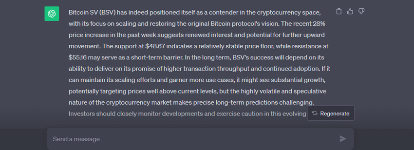 Bitcoin SV (BSV) has generally exhibited a modest level of price volatility compared to its crypto counterparts. ChatGPT says that the BSV is now likely to see whether it can indeed deliver higher transaction throughput and continued adoption.