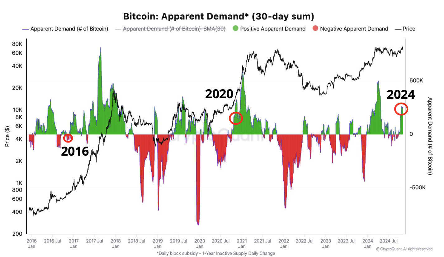 Data from the on-chain data provider also showed that demand for Bitcoin has increased. This is similar to the trends of 2016 and 2020. Hence, if sustained, the Bitcoin price might climb well above $70,000 soon.