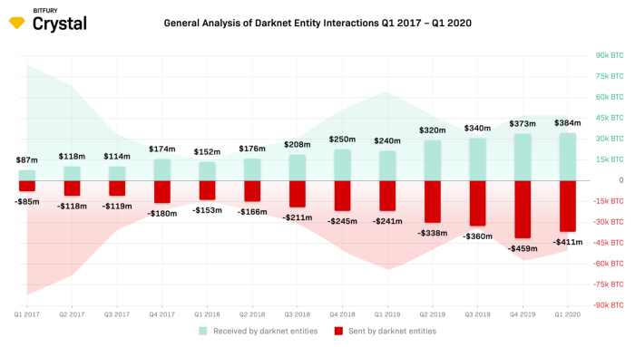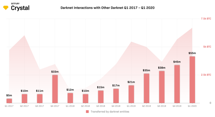 “The share of bitcoin sent from one darknet entity to another (i.e., all transactions between different darknet entities) also grew from 10% in Q1 2019 to 19% in Q1 2020 — indicating overall growth in darknet revenue and cooperation.”