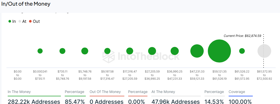 Amid ongoing recovery, IntoTheBlock data shows that 85.47% of active BTC addresses are sitting on unrealized profit. According to the real-time on-chain analytics and market intelligence platform, only 14.53% of active addresses are recording losses.
