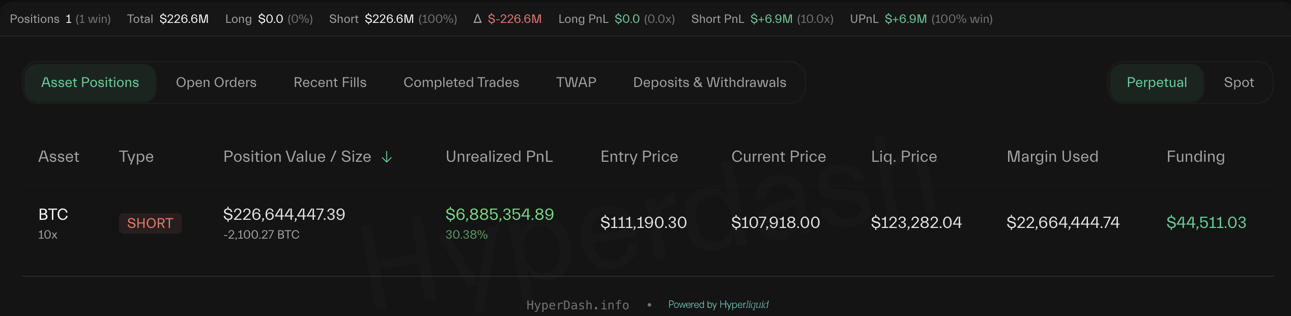 According to the latest data from Hyperdash, the BitcoinOG’s active 10x leveraged short position on Bitcoin is worth $226.6 million. The liquidation price is set at $123,282. Furthermore, the position is currently showing an unrealized profit of around $6.8 million.