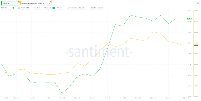 The growing interest in BTC derivatives among institutional investors has begun to evolve in increased demand for Bitcoin. According to on-chain data, a price-savvy cohort of whales holding balances of 1,000 to 10,000 BTC began to buy BTC around June 15.