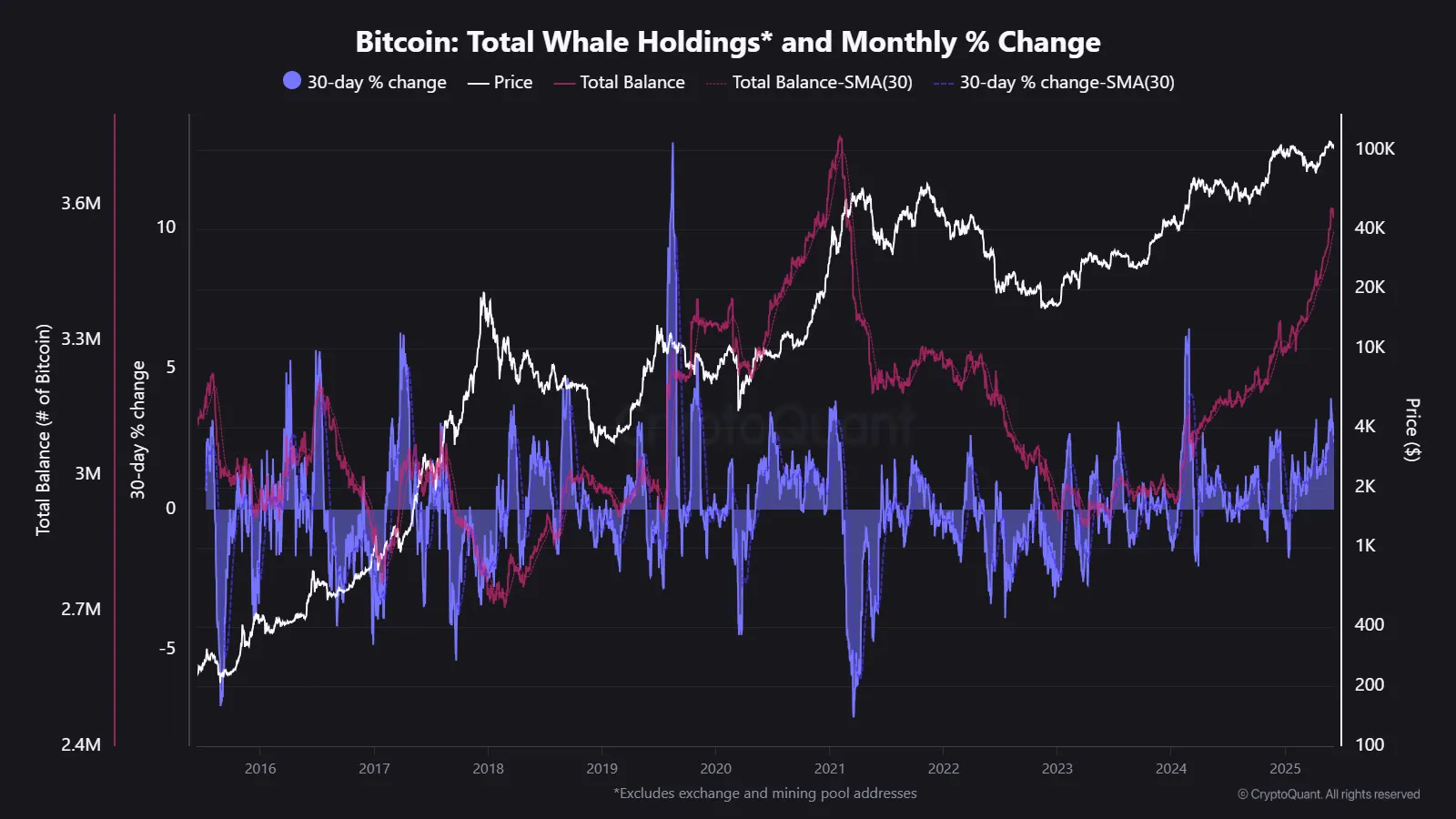 “This metric reflects the true balances of large holders by excluding exchange and mining pool addresses. This offers a clearer view of strategic accumulation by large investors. Remained growth in whale holdings often signals institutional confidence and strong underlying demand, which are key drivers of longer-term bull cycles,” CryptoQuant analyst JA Maartunn told BeInCyprto.