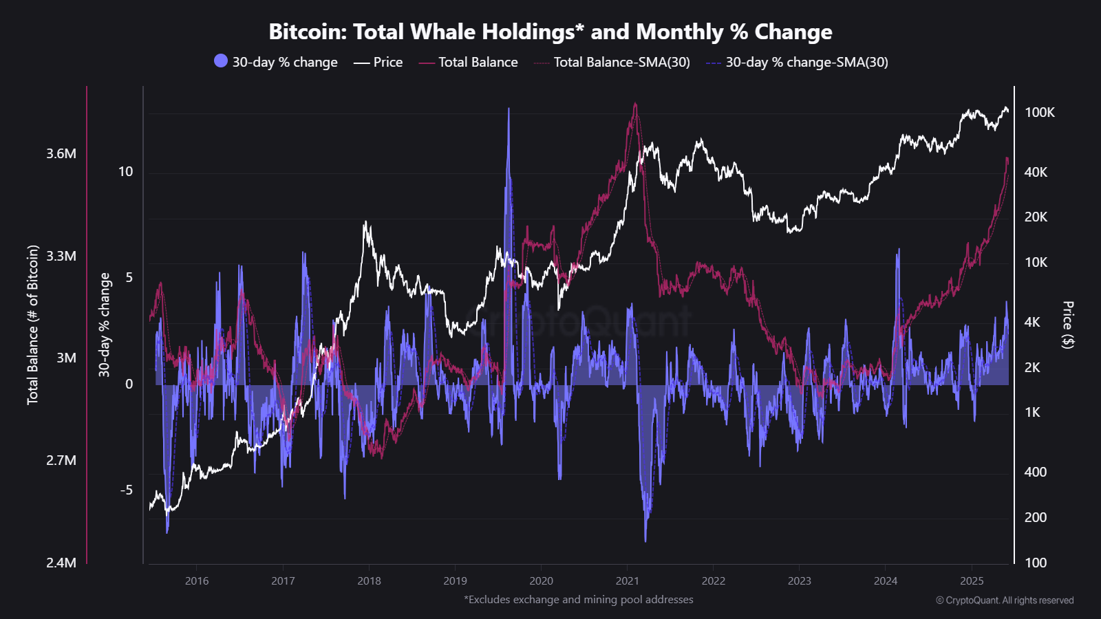 “This metric reflects the true balances of large holders by excluding exchange and mining pool addresses. This offers a clearer view of strategic accumulation by large investors. Remained growth in whale holdings often signals institutional confidence and strong underlying demand, which are key drivers of longer-term bull cycles,” CryptoQuant analyst JA Maartunn told BeInCyprto.