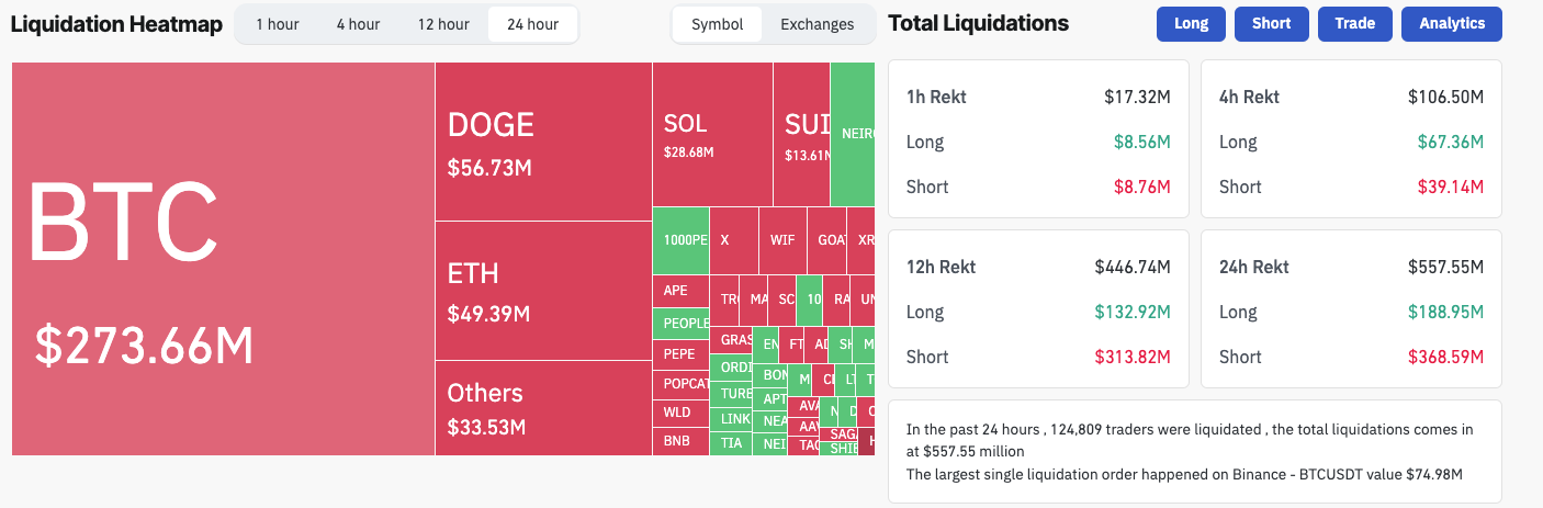 According to Coinglass, election-day volatility triggered a staggering $557 million in liquidations, affecting traders who held leveraged positions.