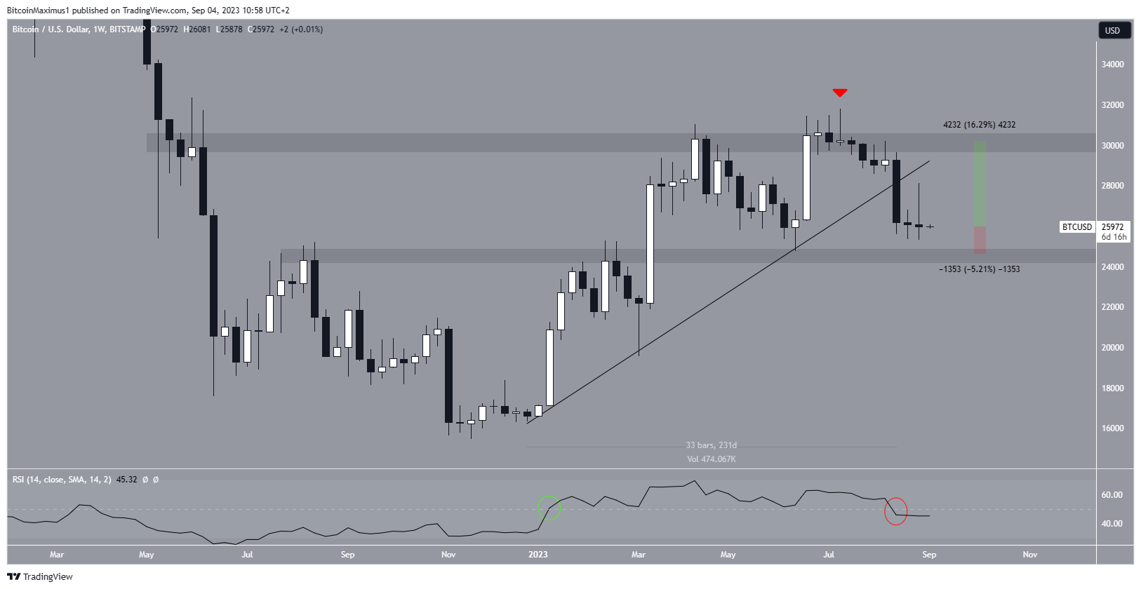 SponsoredIf the BTC price were to break out from the resistance line, it could then increase to the previously outlined $30,000 resistance area.