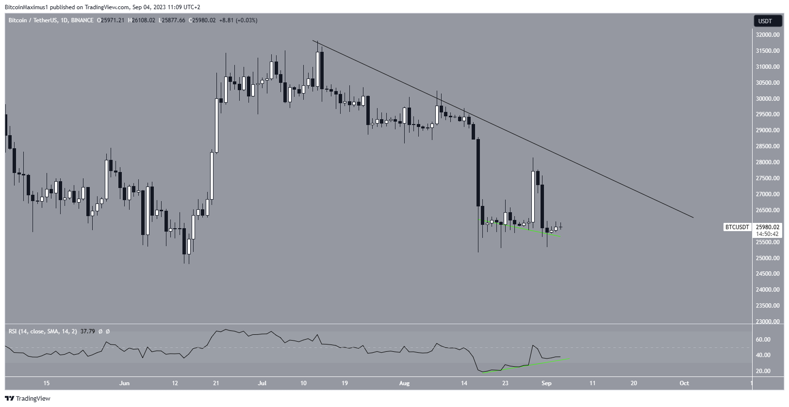 However, despite the divergence, the price has yet to move upward. Rather, it is trading close to its August lows and considerably below the descending resistance line in place since the yearly high. The line is currently at $28,200.