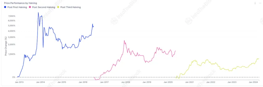 Historically, Bitcoin halvings have been associated with volatility in the short term but bullish trends in the long term. Vincent Maliepaard, Marketing Director at IntoTheBlock, told BeInCrypto that the 2016 and 2020 halvings saw Bitcoin rallying into the events, followed by a drop shortly after, but eventually breaking previous all-time highs within months.