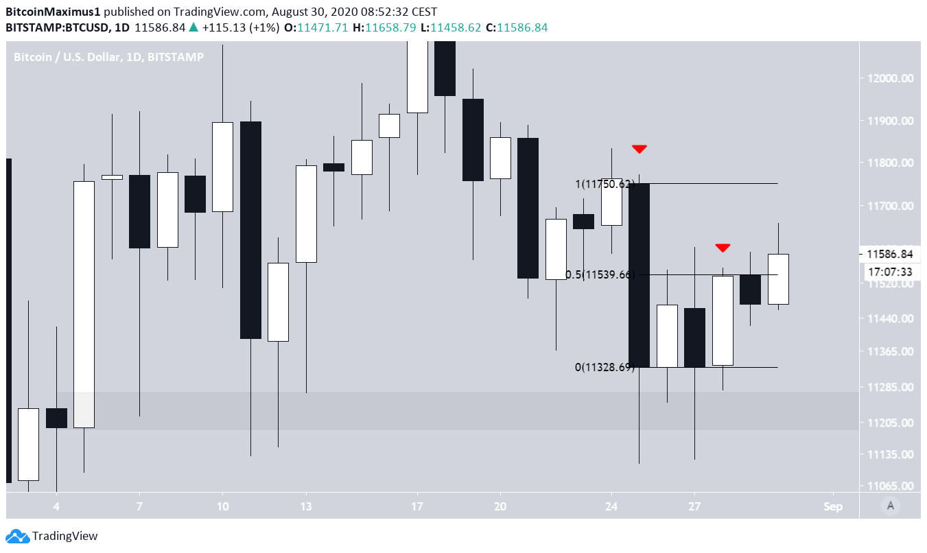 On Aug. 25, the bitcoin price created a bearish engulfing candlestick that took the price to a low of $11,112. However, BTC created a long lower wick and bounced from the $11,200 support area. The price has been retracing upwards since.